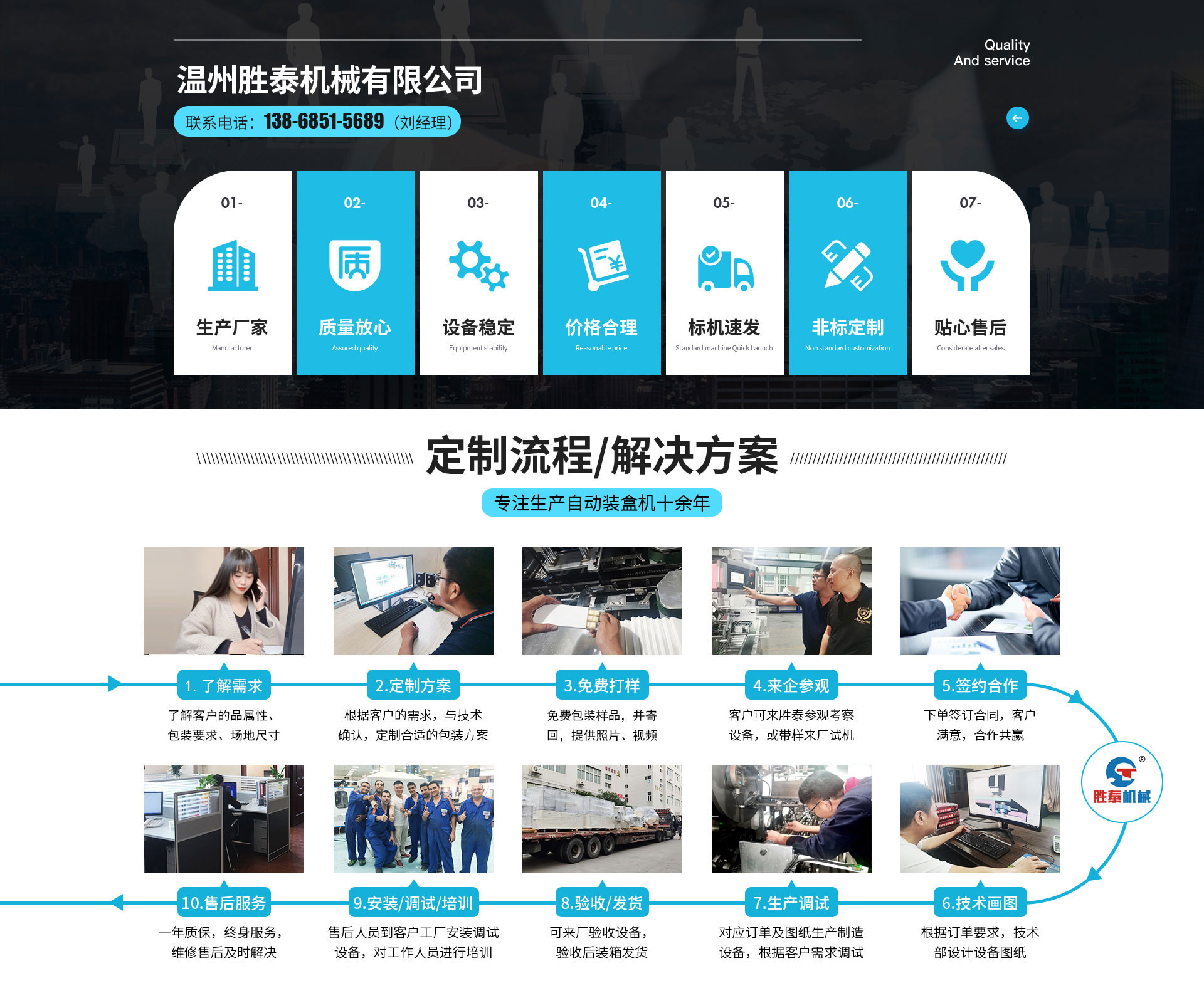 溫州勝泰機械有限公司位于東海之濱, 坐落于"包裝機械城"-溫州市。集研發(fā)、生產(chǎn)、經(jīng)貿(mào)于一體的現(xiàn)代化科技型企業(yè),是國家高新技術(shù)企業(yè),通過了CE認(rèn)證、IS09001質(zhì)量體系認(rèn)證,并獲得了多項專利。從事盒裝紙包裝設(shè)備10余年,具有先進的技術(shù)力量和生產(chǎn)工藝,制造經(jīng)驗豐富、產(chǎn)品質(zhì)量可靠、價格合理、能為廣大客戶提供設(shè)備、技術(shù)、原材料供應(yīng)全方位服務(wù),幫助客戶打造專業(yè)化、智能化、無人化的工業(yè)4.0工廠。